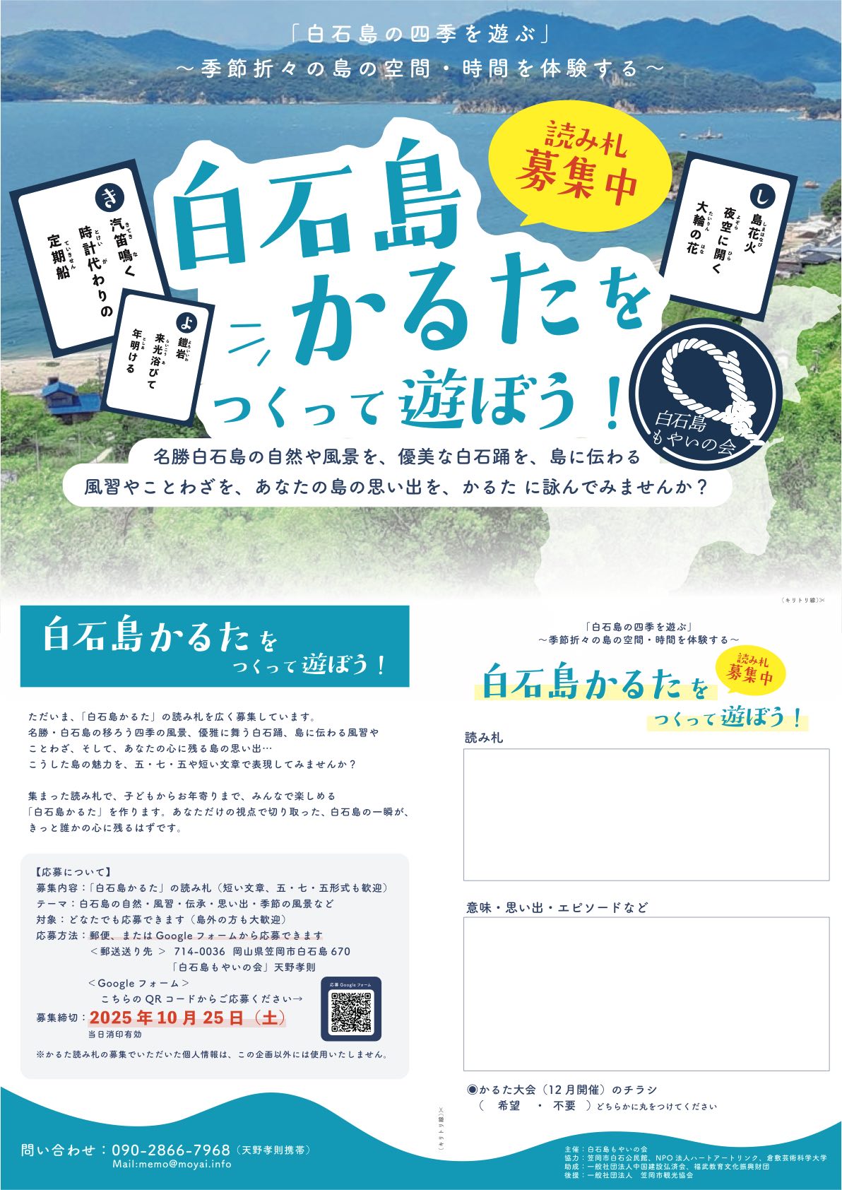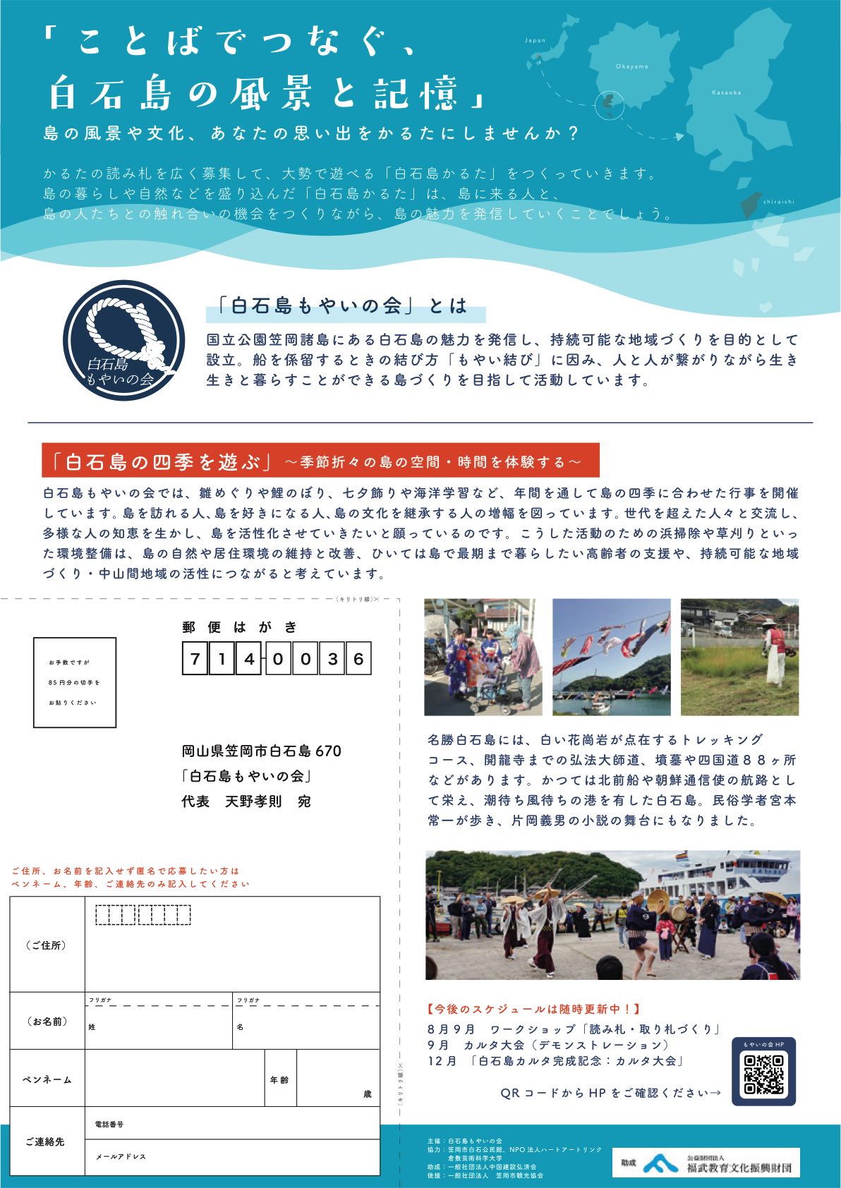 自然豊かで、歴史のある風光明媚な笠岡諸島。 白石島は、少子高齢化が急速に進んでいますが、白い花崗岩が点在する白石島は、江戸時代には沿岸航路の中継地として栄え、漁業や砕石、綿栽培も盛んでした。白石踊は、古くから伝わる盆踊りで国指定重要無形文化財です。令和4年11月30日にユネスコ無形文化遺産に「風流踊」の一つとして登録されました。 私たちは、国立公園でもある白石島の魅力を発信し、持続可能な地域づくりを目的として活動をしています。